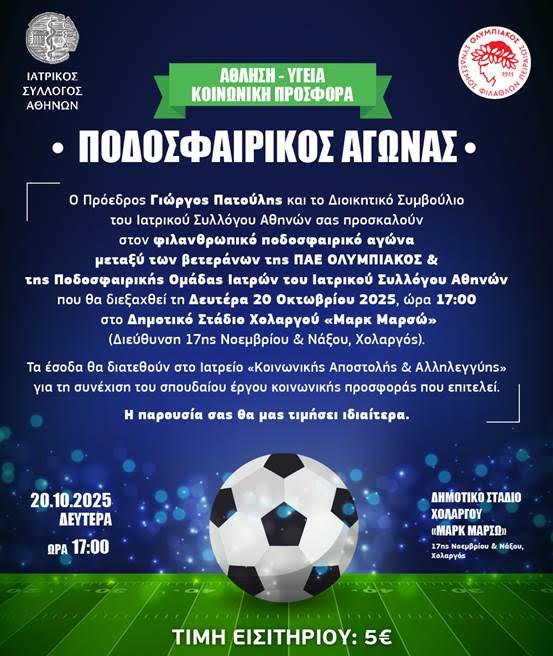 Σας ενημερώνουμε ότι Ο Ιατρικός Σύλλογος Αθηνών διοργανώνει Φιλανθρωπικό Ποδοσφαιρικό Αγώνα μεταξύ των Βετεράνων της ΠΑΕ Ολυμπιακός και της Ποδοσφαιρικής ομάδας των Ιατρών του Ιατρικού Συλλόγου Αθηνών, στις 20 Οκτωβρίου 2025, ώρα 17:00 στο Δημοτικό Στάδιο Χολαργού «Μαρκ Μαρσώ».