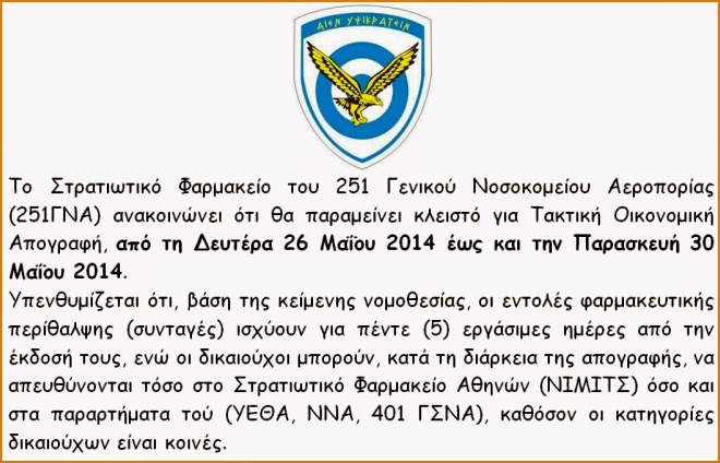 ΓΕΑ: Αναστολή Λειτουργίας Στρατιωτικού Φαρμακείου του 251ΓΝΑ